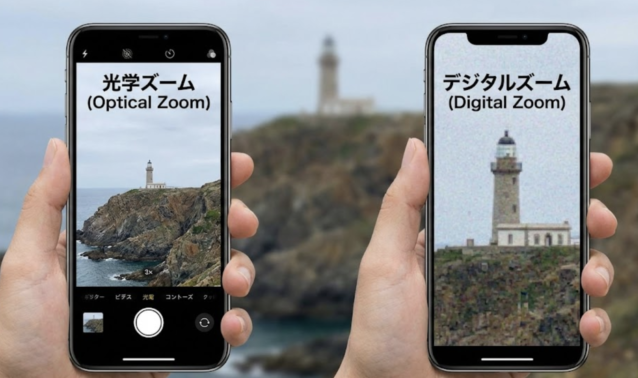 iPhoneの光学ズームの範囲を超えてさらにアップすると、デジタルズームになって、1枚の写真をトリミングして無理やり大きくしている状態になります。そうすると、1つ1つのピクセルが大きくなって、全体的にガビガビした感じになってしまうので、画質が悪いと感じているのかもしれません。