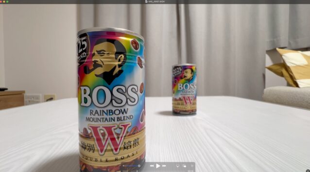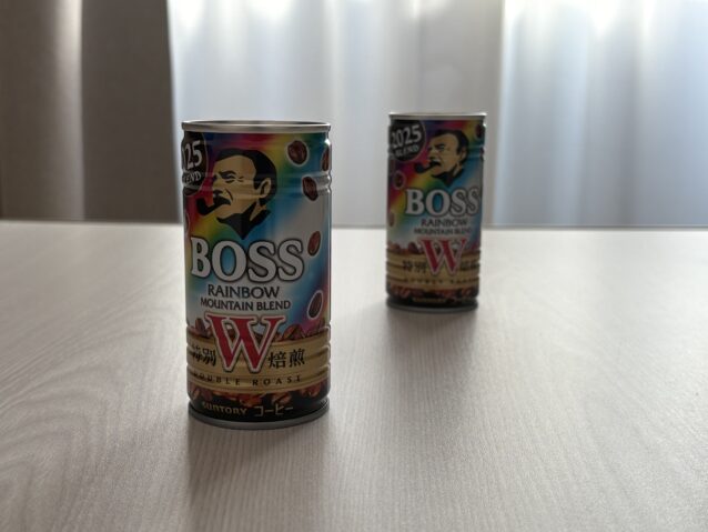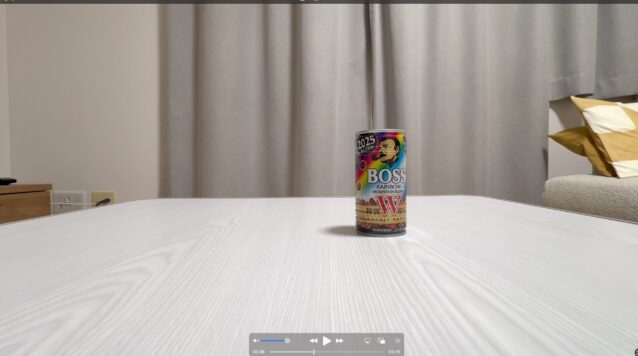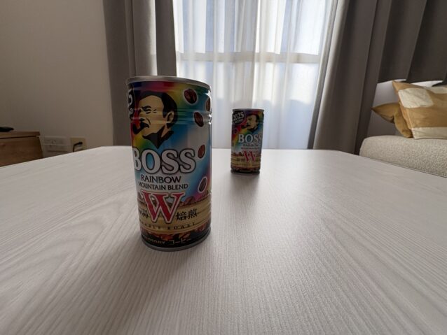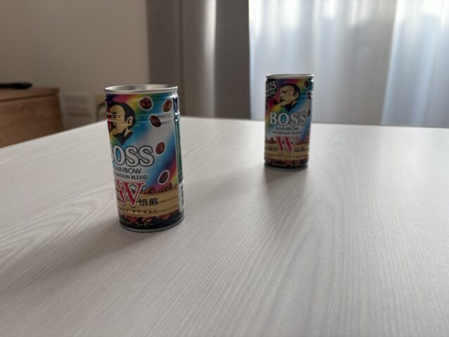 同じ大きさのコーヒー缶を、手前と奥に置いています。